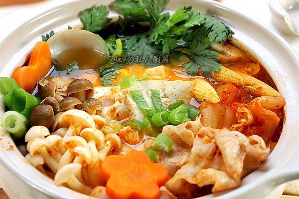 9 最後熄火前放入山茼蒿及蔥段即完成。用泡菜煮出的湯頭濃郁,結合了蛤蜊的鮮甜和蔬菜菇類的美味,豆腐及雞蛋吸滿了湯頭精華,熱呼呼的每一口都吃得好享受~~