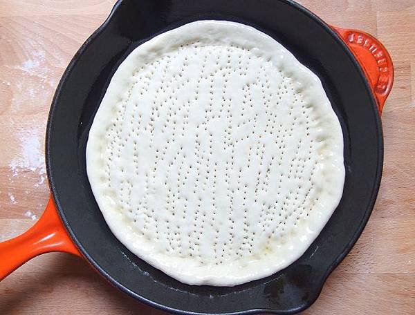 13 準備一個鑄鐵平底鍋或大烤盤,將平底鍋抹上一層薄薄的油,再將桿好的麵皮放進,用叉子將麵皮表面戳一些洞。